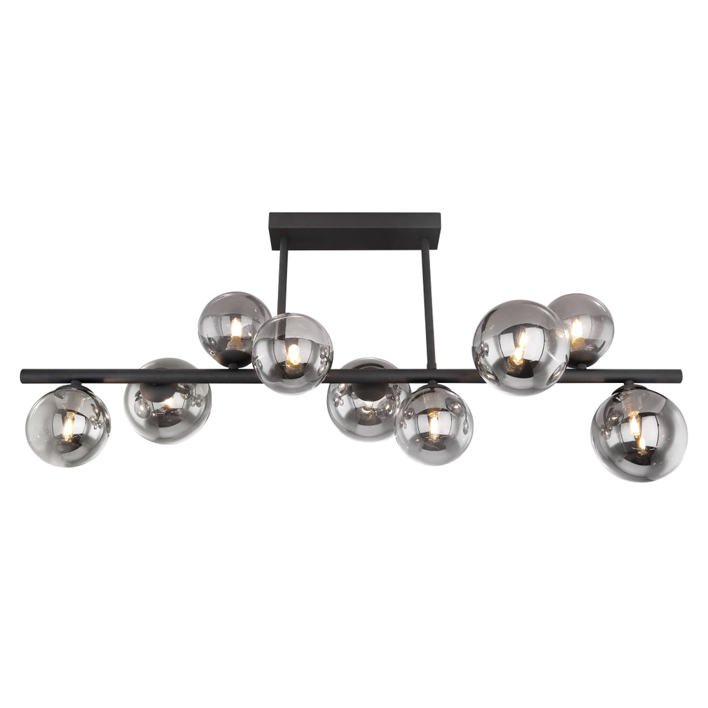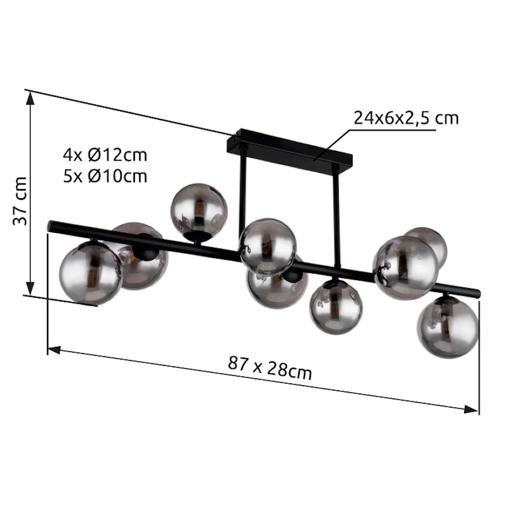 Plafoniera moderna Riha a 9 luci in metallo nero con sfere in vetro grigio fumè di diverse misure. Larghezza 87 cm, profondità 30 cm, altezza 38 cm. Lampadine LED attacco G9 incluse, 9 × 3W, 3150 lumen, luce bianco caldo 3000K, lampadine sostituibili. IP20.