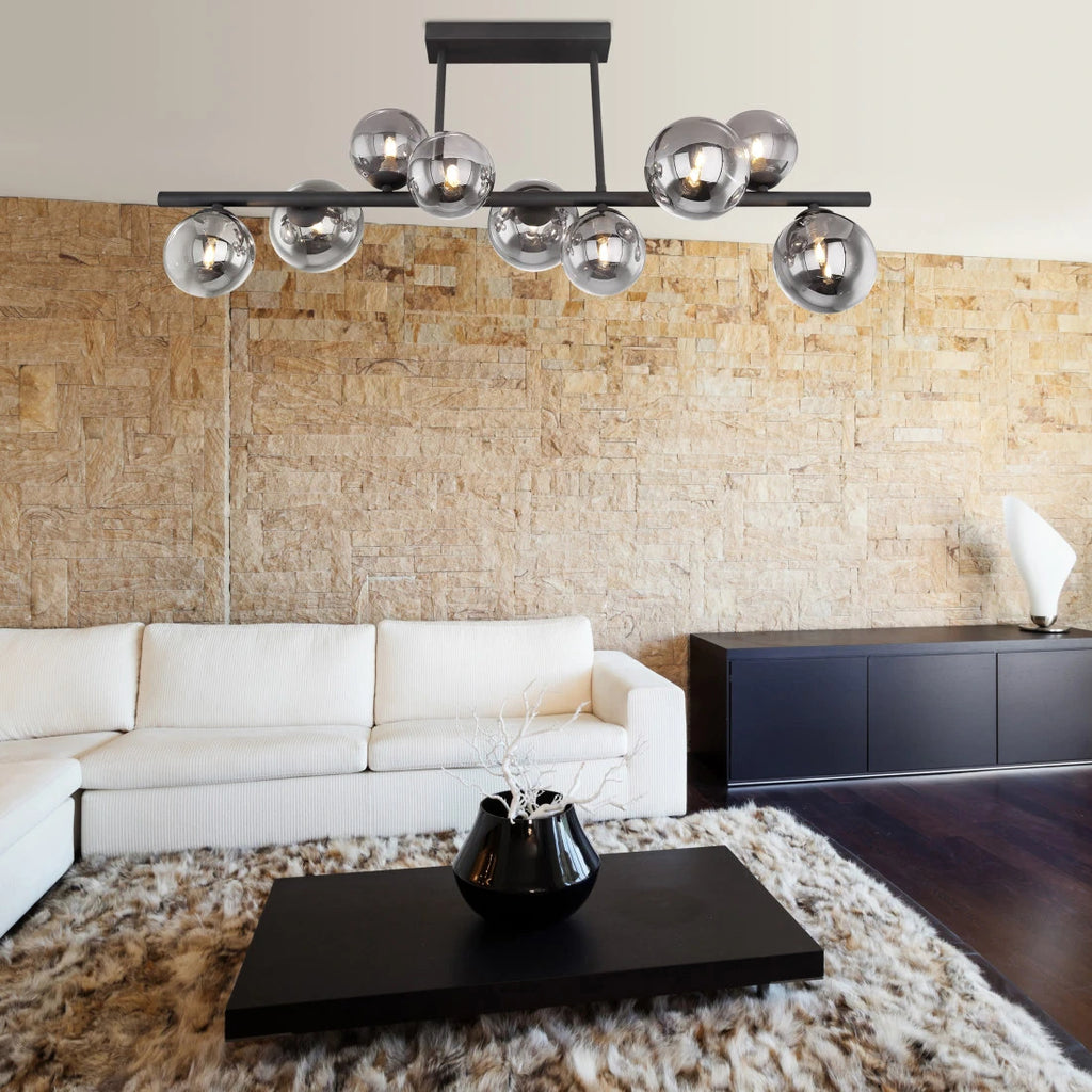La plafoniera LED moderna Riha 9 luci in metallo nero con sfere in vetro grigio fumè è pensata per chi desidera un punto luce scenografico e contemporaneo. La struttura orizzontale da 87 cm ospita sfere di diverse dimensioni, creando un effetto dinamico e decorativo perfetto sopra il tavolo da pranzo o al centro della zona living.