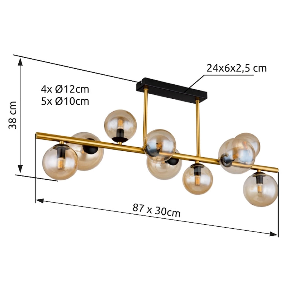 Plafoniera Riha classica a barra in metallo finitura oro ottone lucido con sfere in vetro ambra di diverse misure, lunghezza 87 cm. 9 lampadine LED attacco G9 incluse, 9 × 3W (3150 lumen totali), luce bianco caldo 3000K, lampadine sostituibili. IP20.
