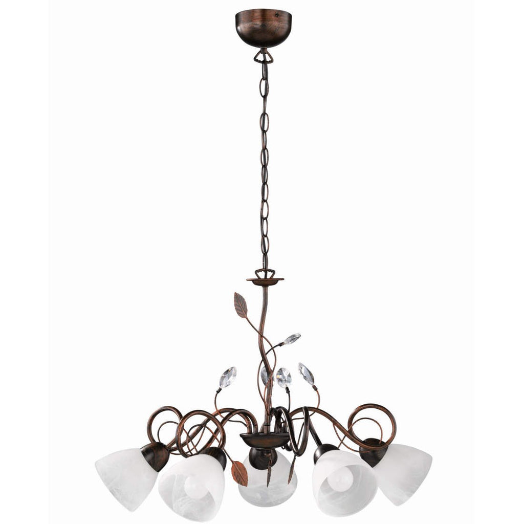 Lampadario a sospensione 5 luci in metallo con finitura ruggine corten antichizzata e vetri alabastro bianchi decorati. Diametro 70 cm, altezza regolabile fino a 150 cm. Attacco E14 (5 lampadine non incluse). Stile arte povera, ideale per soggiorni e sale da pranzo.