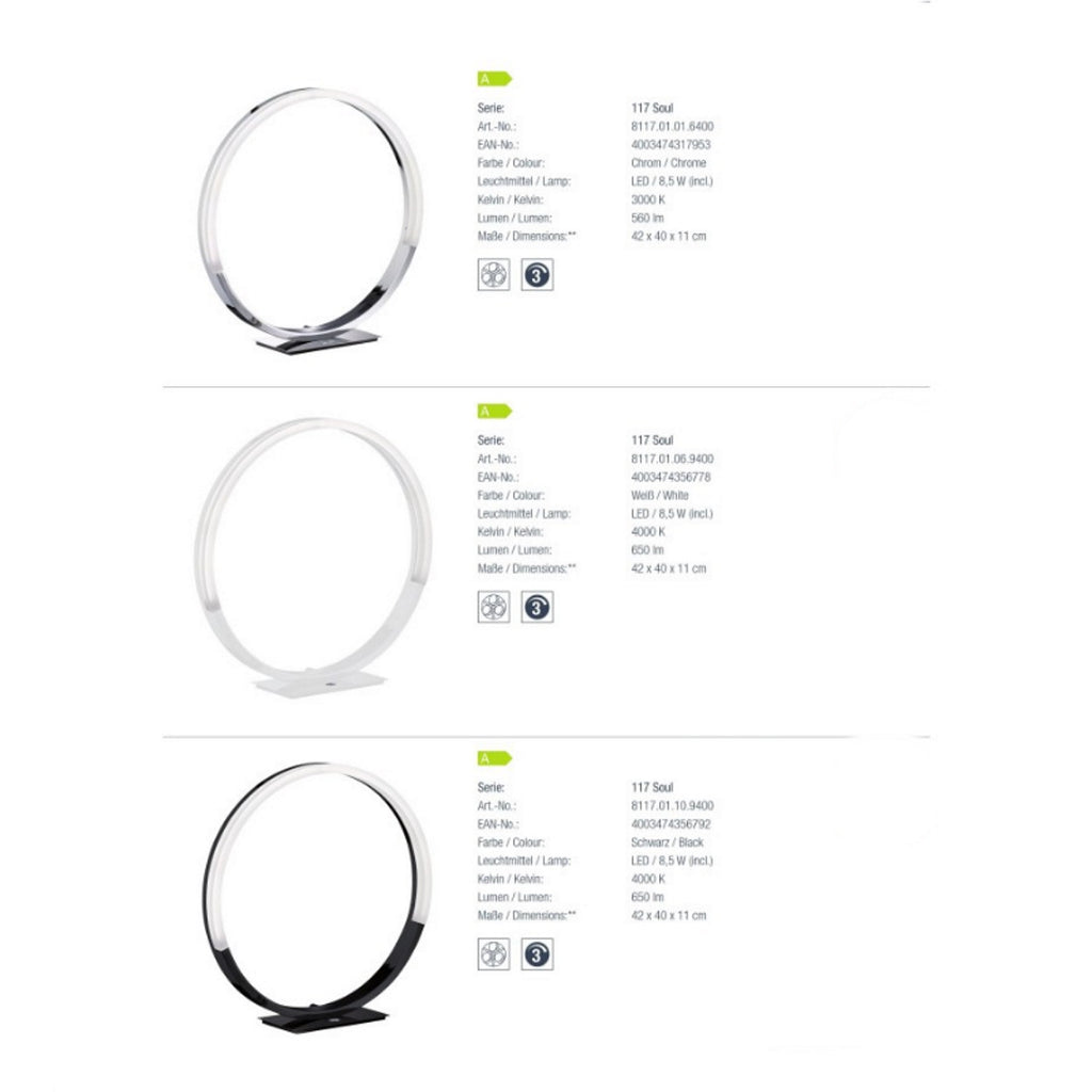 Lampada da tavolo moderna in metallo bianco con LED 8,5W, 650 lumen, luce bianco neutro 4000K. Altezza 42 cm. Regolazione luminosa a 3 livelli tramite TouchDimmer integrato. Ideale per scrivanie, comodini e ambienti domestici moderni.