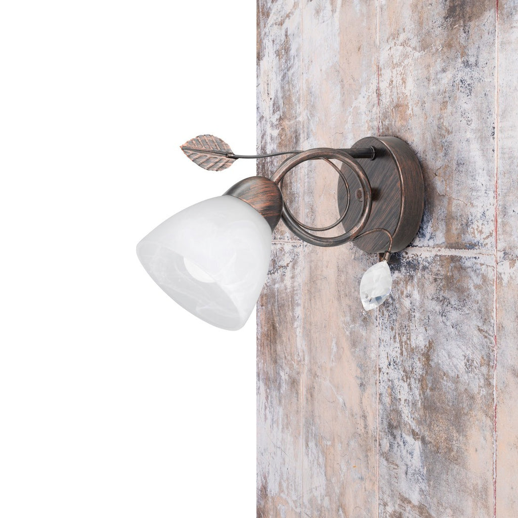 Applique da parete in metallo finitura ruggine con vetro alabastro e decoro floreale in stile arte povera. 1 lampadina attacco E14 (non inclusa). Ideale per ambienti rustici, taverne o soggiorni classici.