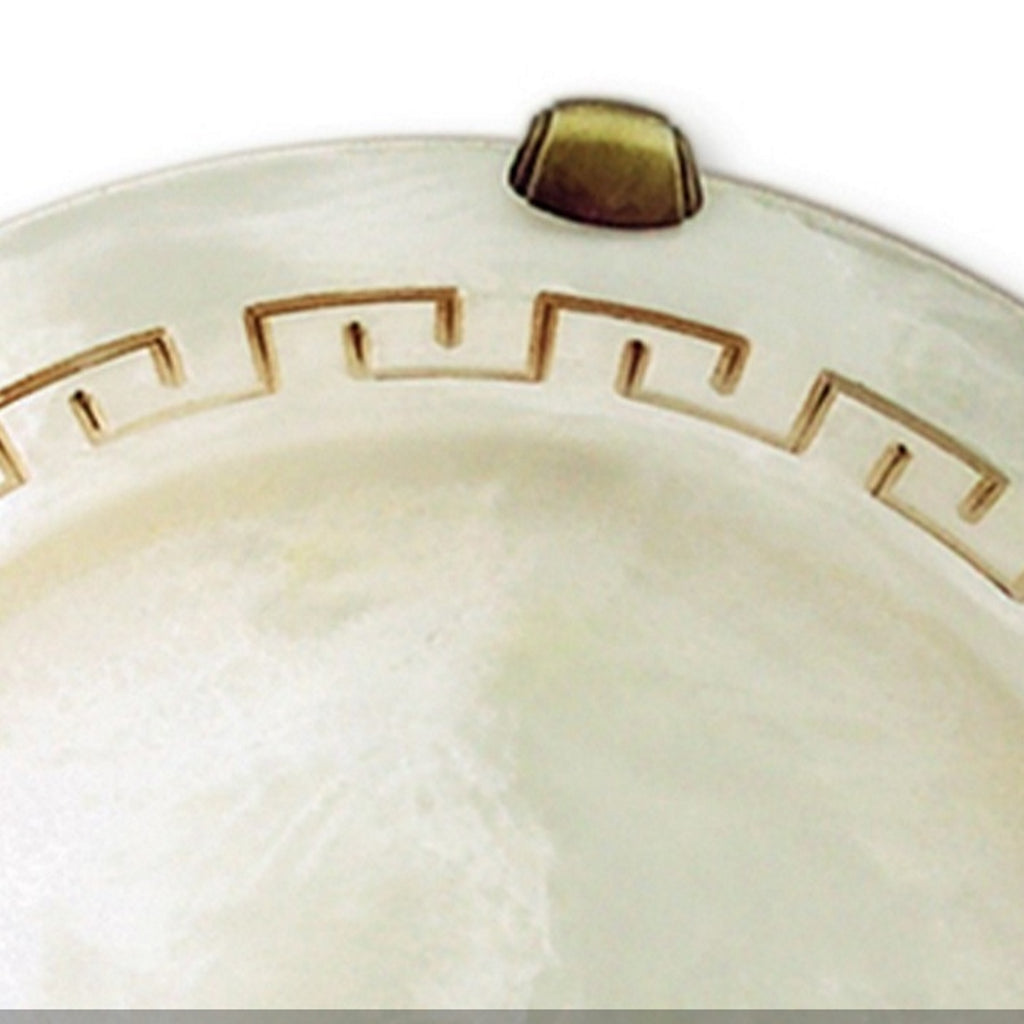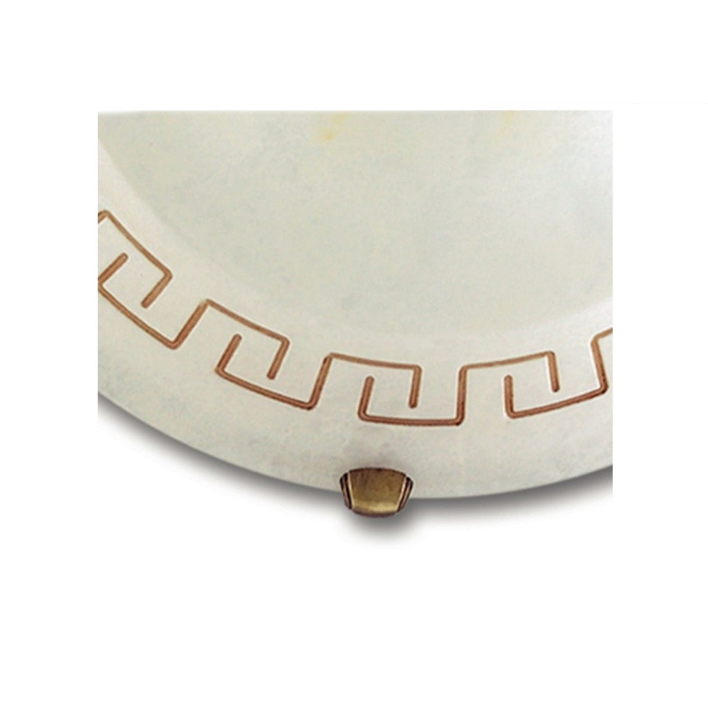 Plafoniera tradizionale a una luce con struttura in vetro ambrato decorato con greca marrone. Stile classico rustico, diametro 40 cm. Attacco E27 per 2 lampadine (non incluse). Ideale per ambienti classici, rustici o country chic.