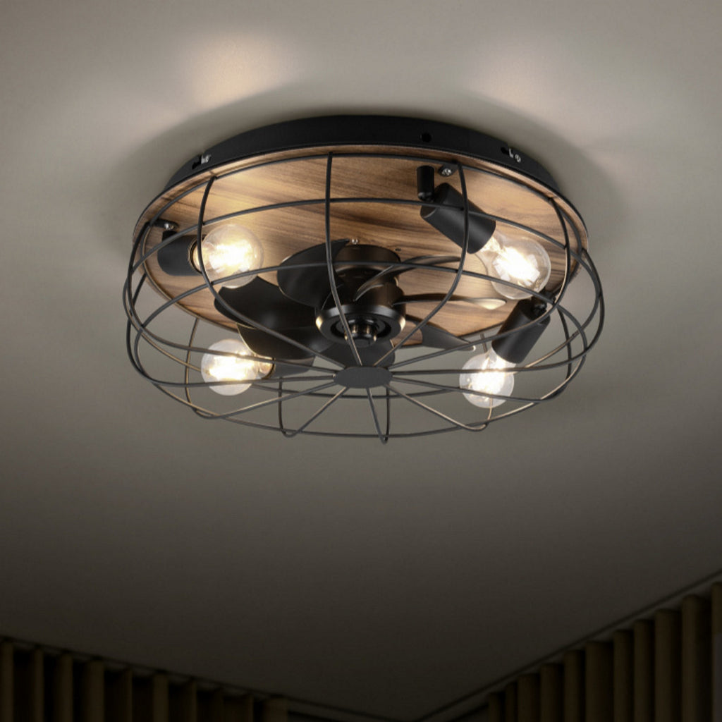 Plafoniera Ø48 cm, H17 cm. Ventilatore integrato a 3 velocità con accensioni separate. Struttura metallo nero e fondo legno a vista. 4 portalampade E27 (lampadine escluse). Telecomando con timer e luce notturna.