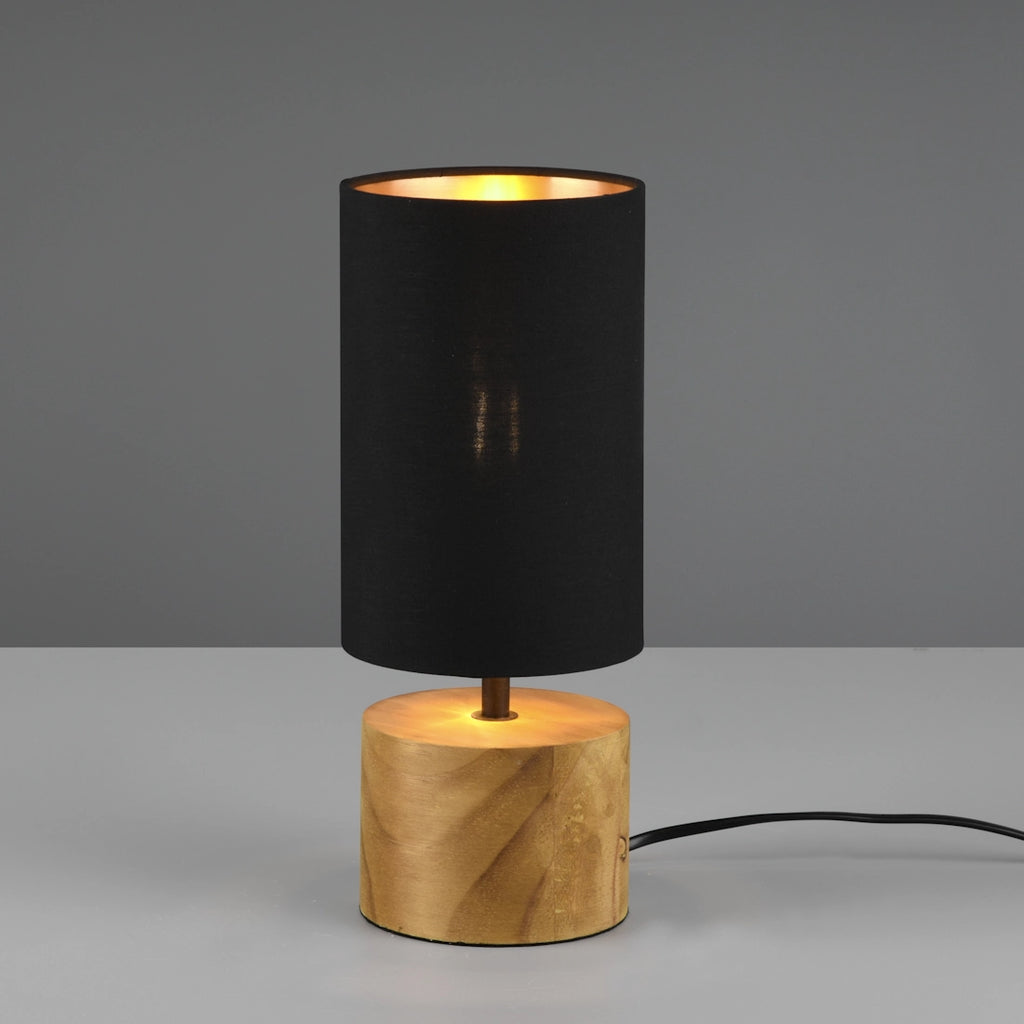 Lampada da tavolo Woody in legno con paralume nero e interno oro. Altezza 30 cm, diametro 12 cm. Attacco E14, lampadina non inclusa. Stile moderno e naturale, ideale per comodini, scrivanie e soggiorni dal gusto elegante.