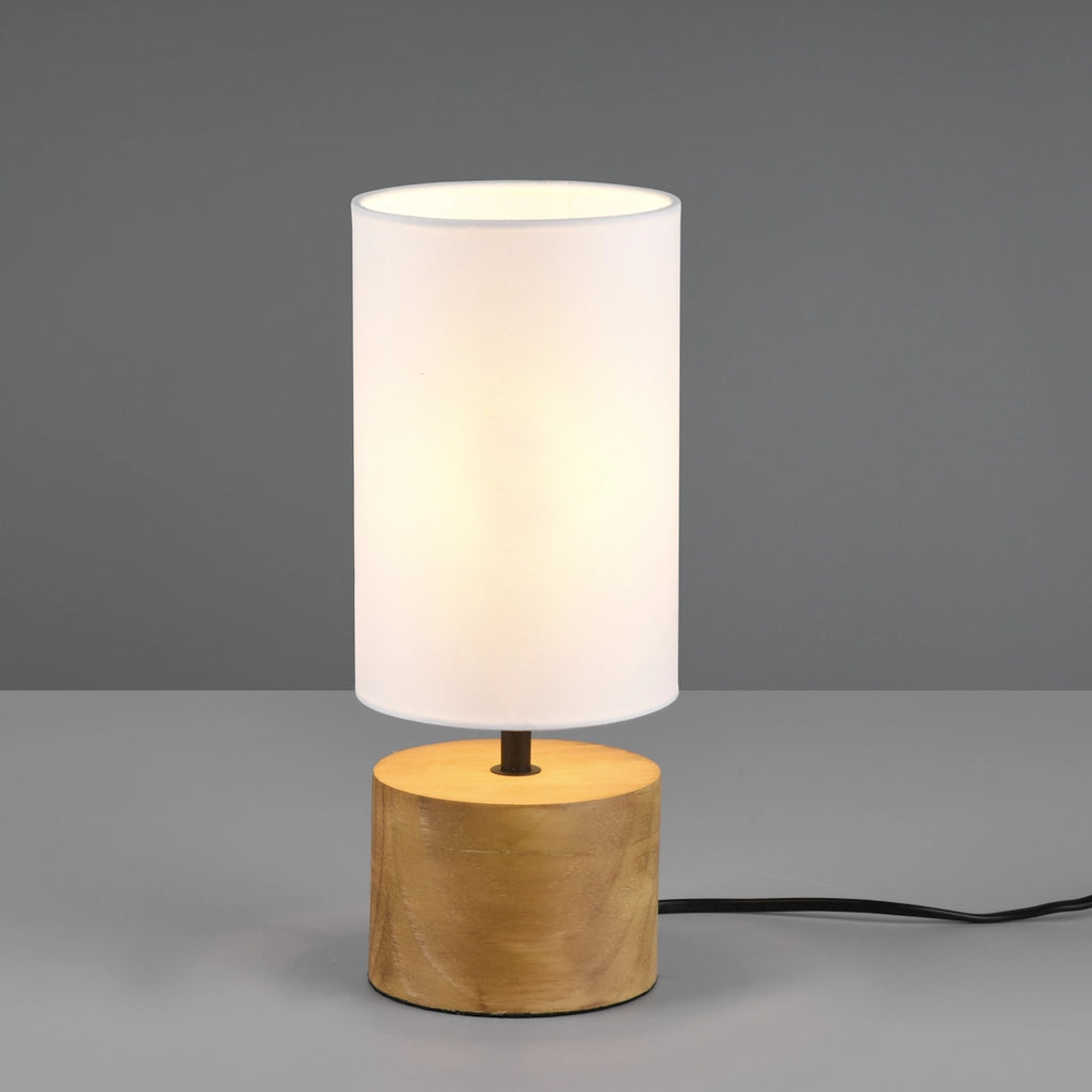 Lampada da tavolo in legno naturale con paralume in tessuto bianco. Altezza 30 cm, diametro 12 cm. Attacco E14 (lampadina non inclusa). Stile moderno/naturale; ideale per comodini, scrivanie e mobili d’arredo.